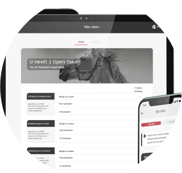 U ontvangt realtime meldingen, volgt de voortgang in uw dashboard en werkt live samen met uw advocaat – zonder losse mails of verwarring. Onze slimme AI helpt u prioriteren, bespaart tijd en voorkomt fouten.