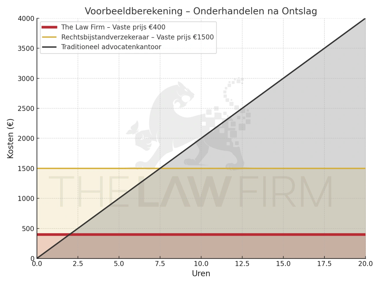 Heldere afspraken vooraf. Geen uurtarief, wel een complete onderhandeling van intake tot akkoord – voor €400. De laagste prijs in de markt.