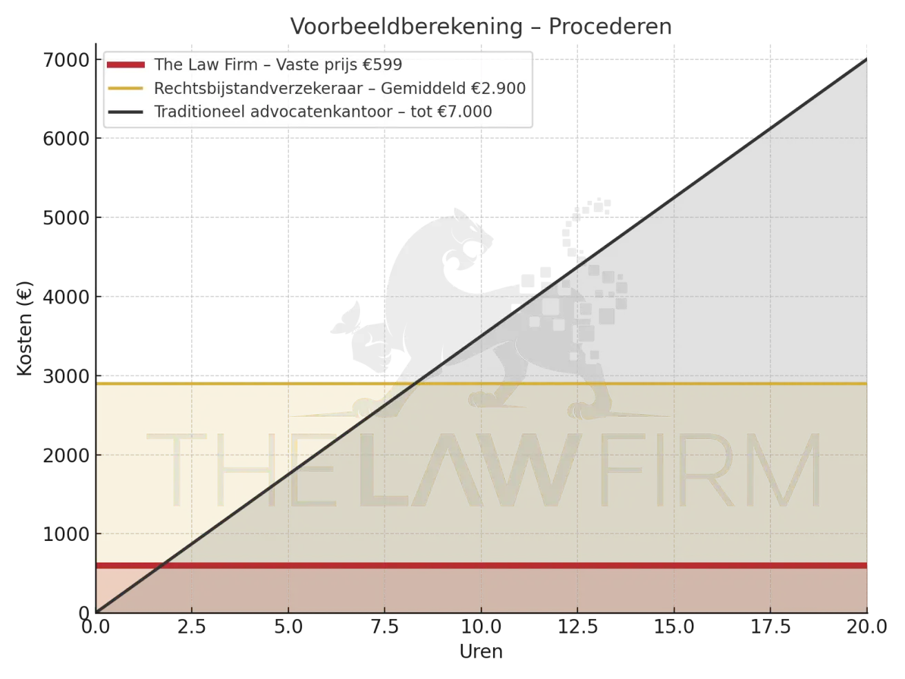 - Geen verborgen kosten – Vaste prijs zonder onverwachte rekeningen zoals bij traditionele advocatenkantoren of kleine lettertjes bij rechtsbijstandverzekeraars.
