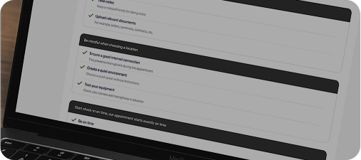 - Beantwoord bij het boeken enkele korte vragen, zodat uw advocaat zich optimaal kan voorbereiden.